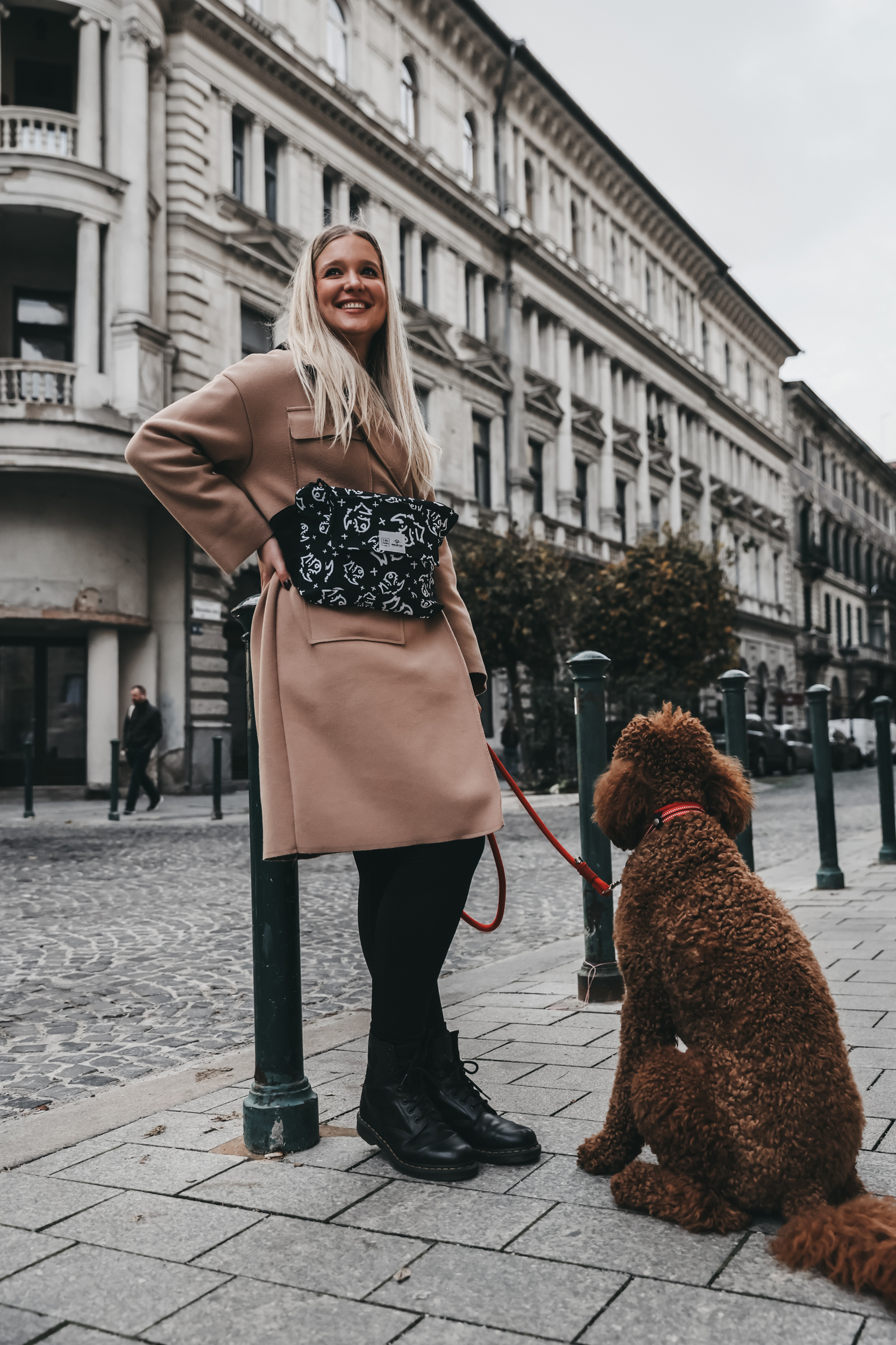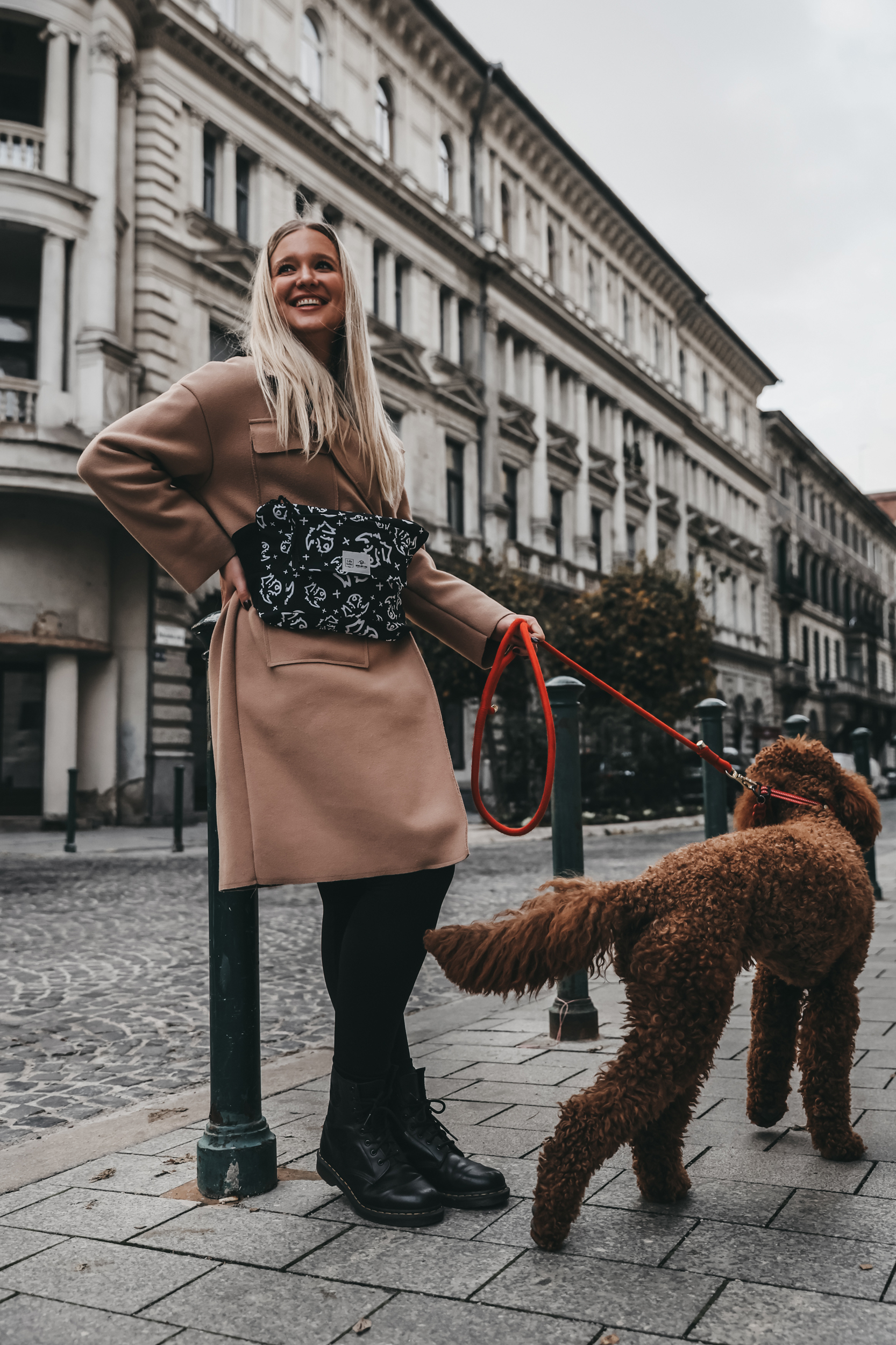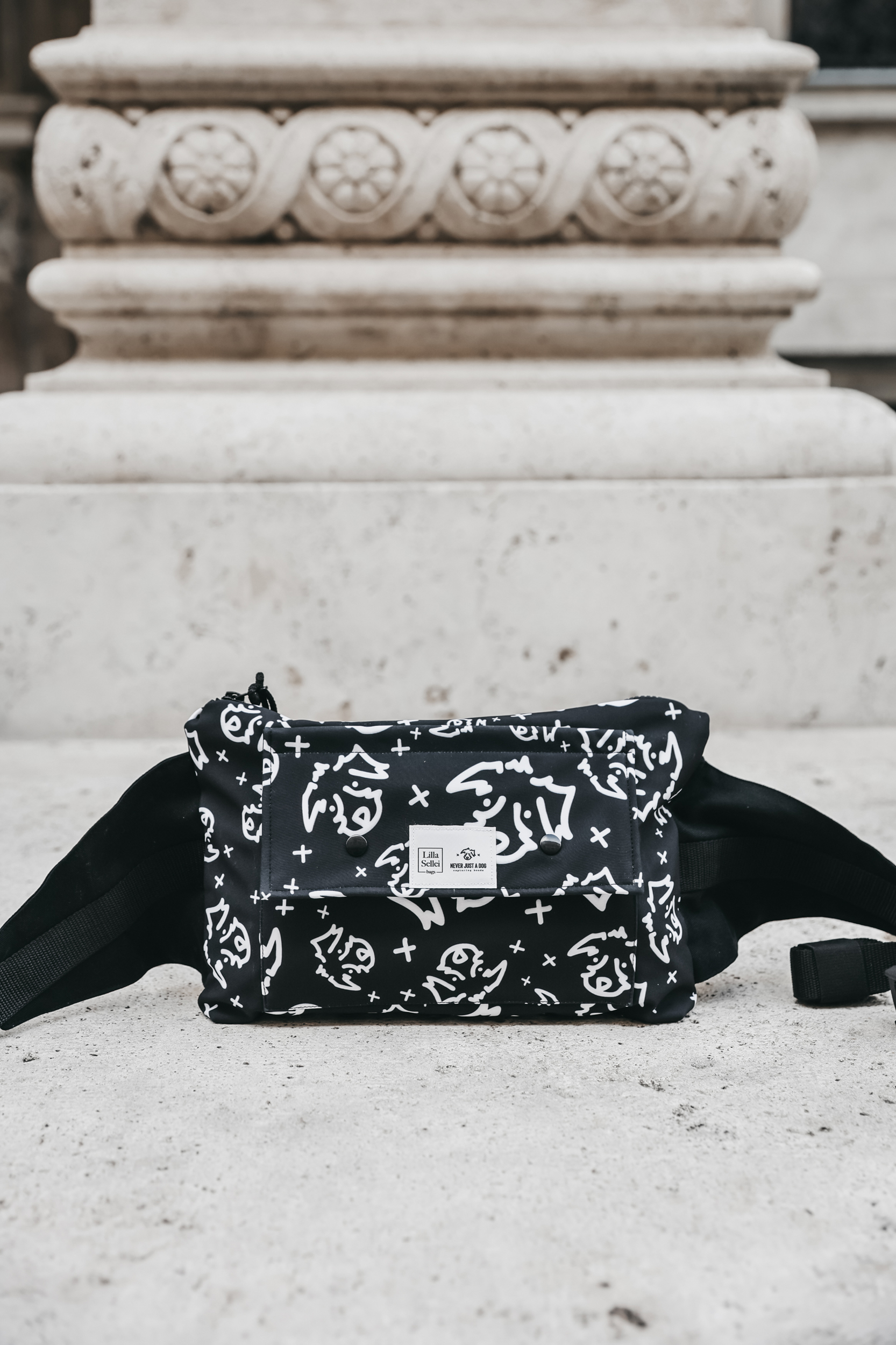 Keresztbe vetve vagy derékon is viselhető kis méretű táska, amelynek formája teljesen azonos a koktéltáskák fazonjával. Széles derékkialakítása ugyanolyan kényelmessé teszi, mint amilyen az oversize övtáskánk viselése. Kitűnő választás, amikor az oversize övtáska túl nagy lenne, de egy kényelmes, övtáskát/cross body táskát szeretnél választani. Kívül a LSB x NEVER JUST A DOG kollaboráció fekete-fehér kutyusokkal díszített softshell anyagból, belül fekete vászonból készült. Műanyag kellékei feketék, a hevederek szintén. Szája cipzárral záródik, kívül egy nagy méretű patentos zsebbel is rendelkezik.