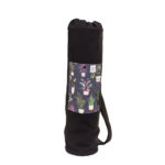 Jógamatrac szállítására tervezett táska. Kívül türkiz virágos softshell anyagból, belül sötétkék vászonbéléssel, összehúzható szájjal készült. Kívül egy nagyobb, türkiz virágos mintás zsebet kapott, amibe belefér a bérlet, telefon vagy éppen a jógacipő. Szürke hevederből készült keresztbe vethető pántja állítható, de akár le is csatolható.