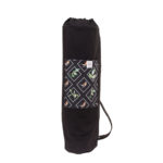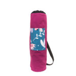 Jógamatrac szállítására tervezett táska. Kívül türkiz softshell anyagból, belül fekete vászonbéléssel, összehúzható szájjal készült. Kívül egy nagyobb, türkiz virágos mintás zsebet kapott, amibe belefér a bérlet, telefon vagy éppen a jógacipő. Fekete hevederből készült keresztbe vethető pántja állítható, de akár le is csatolható.