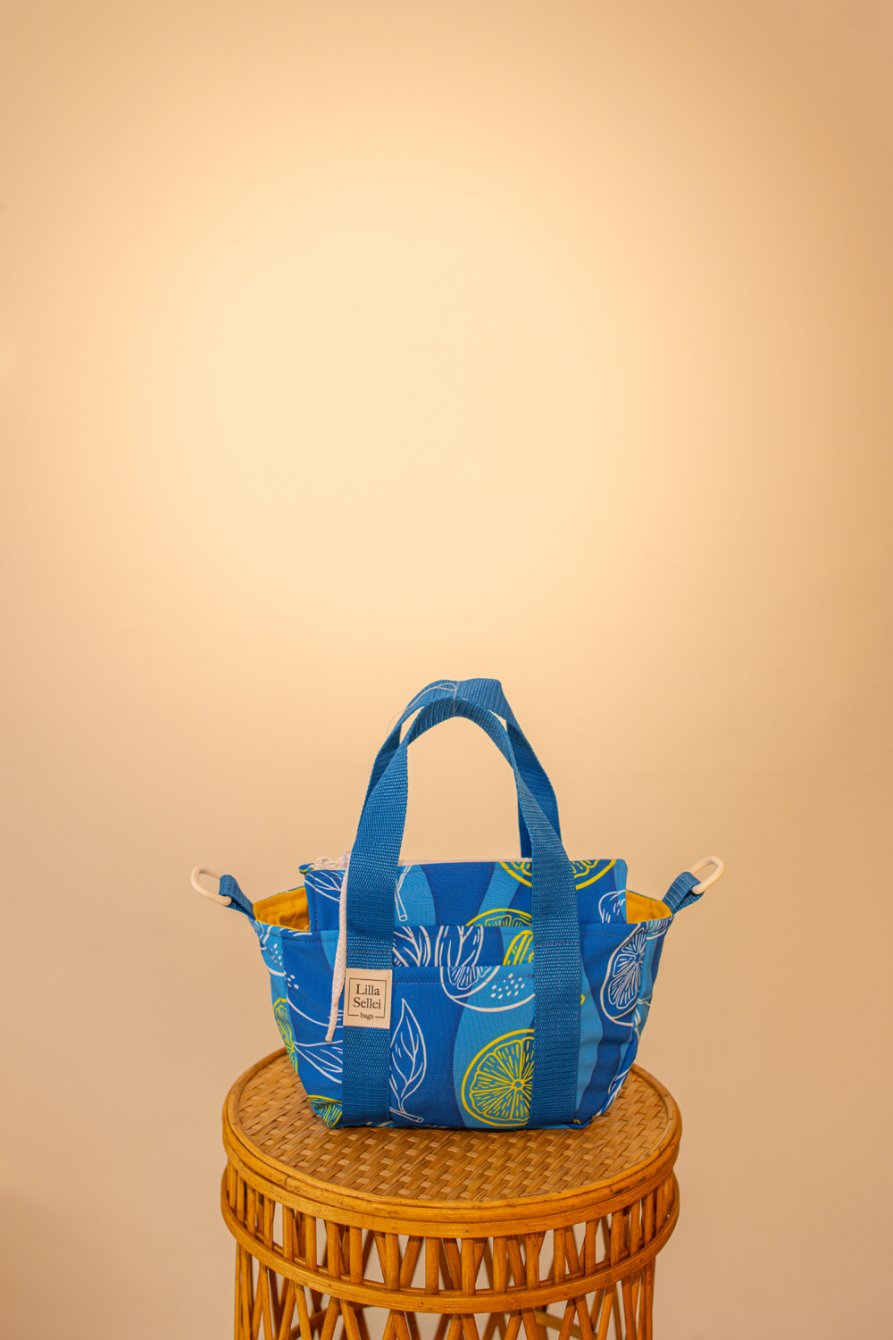 Kézben vagy keresztbe vetve viselhető, kis méretű kézitáska. Kitűnő választás azokra az alkalmakra, amikor anya kimenőt kap, és tényleg pár apróságot szeretne magával vinni. Kívül a 2026-os tavasz-nyári ADRIA kollekció citrommintás softshell anyagából, belül sárga vászonbéléssel készült, cipzáros kistáska. Műanyag kellékei fehérek, a hevederek kék színűek. Vállpántja leszerelhető, így anélkül is viselhető. Szája cipzárral záródik, kívül és belül is egy-egy zsebbel rendelkezik.