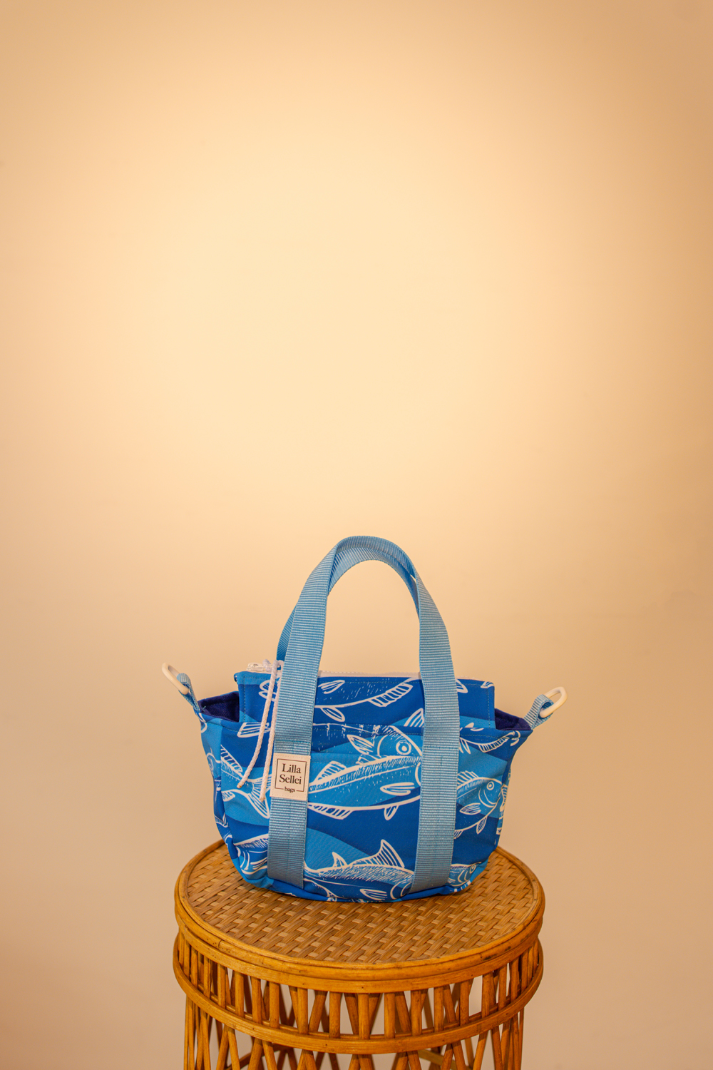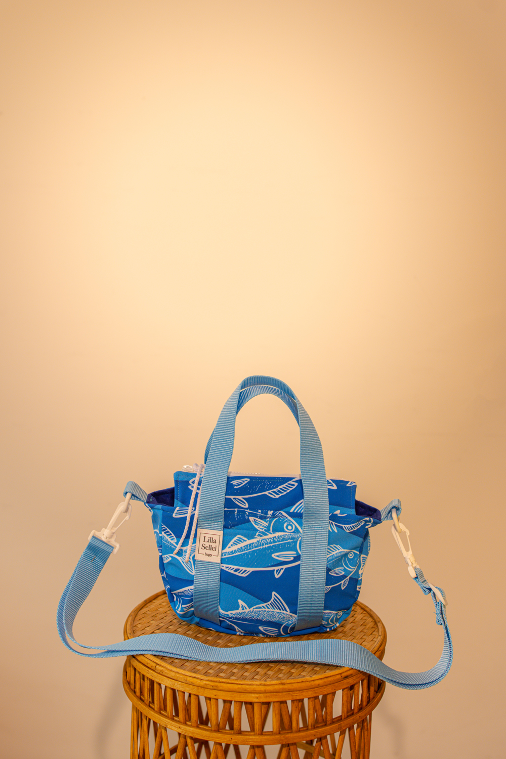 Kézben vagy keresztbe vetve viselhető, kis méretű kézitáska. Kitűnő választás azokra az alkalmakra, amikor anya kimenőt kap, és tényleg pár apróságot szeretne magával vinni. Kívül a 2026-os tavasz-nyári ADRIA kollekció halmintás softshell anyagából, belül kék vászonbéléssel készült, cipzáros kistáska. Műanyag kellékei fehérek, a hevederek világos kék színűek. Vállpántja leszerelhető, így anélkül is viselhető. Szája cipzárral záródik, kívül és belül is egy-egy zsebbel rendelkezik.