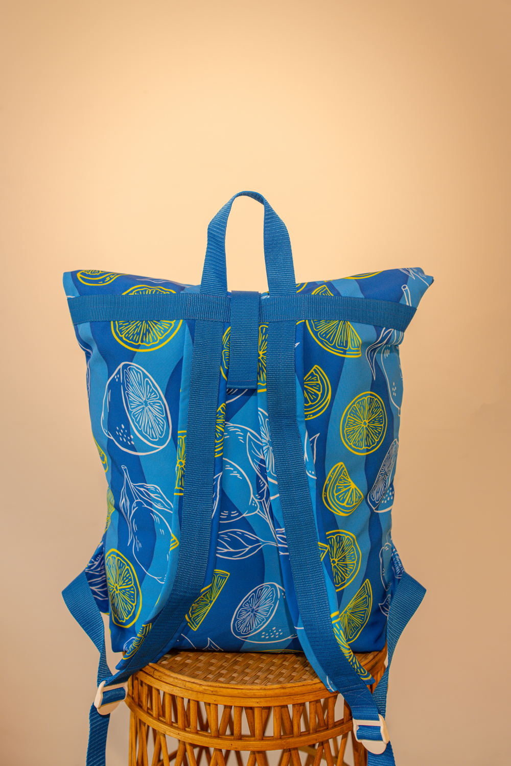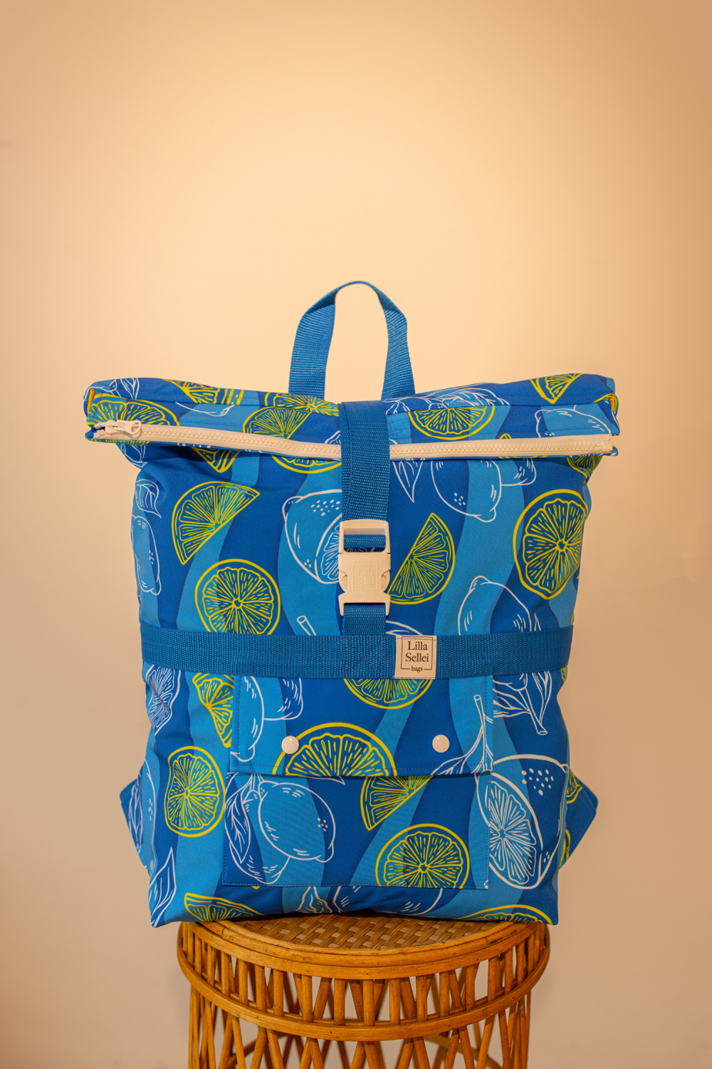 Közepes méretű (a variálható hátizsáknál nagyobb, de a nagyméretű hátizsáknál kisebb), kívül az 2026-os tavasz-nyári ADRIA kollekció citrommintás softshell anyagából, belül sárga vászonbéléssel készült rollos típusú hátizsák. A táskán elől található egy két patenttal záródó külső zseb. Cipzáros belső zseb pedig két patenttal rögzíthető a táska belsejéhez, de külön neszeszerként vagy koktéltáskaként, sőt övre/övtáskára fűzve is hordható. Pántjai kék színűek, puha szivaccsal ellátottak. A csatja fehérek, a többi műanyag kellék is. A rollosan letekerhető szája egy csattal és cipzárral záródik. A hátizsák száját kitekerve a táska űrtartalma bővíthető.