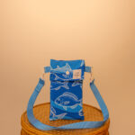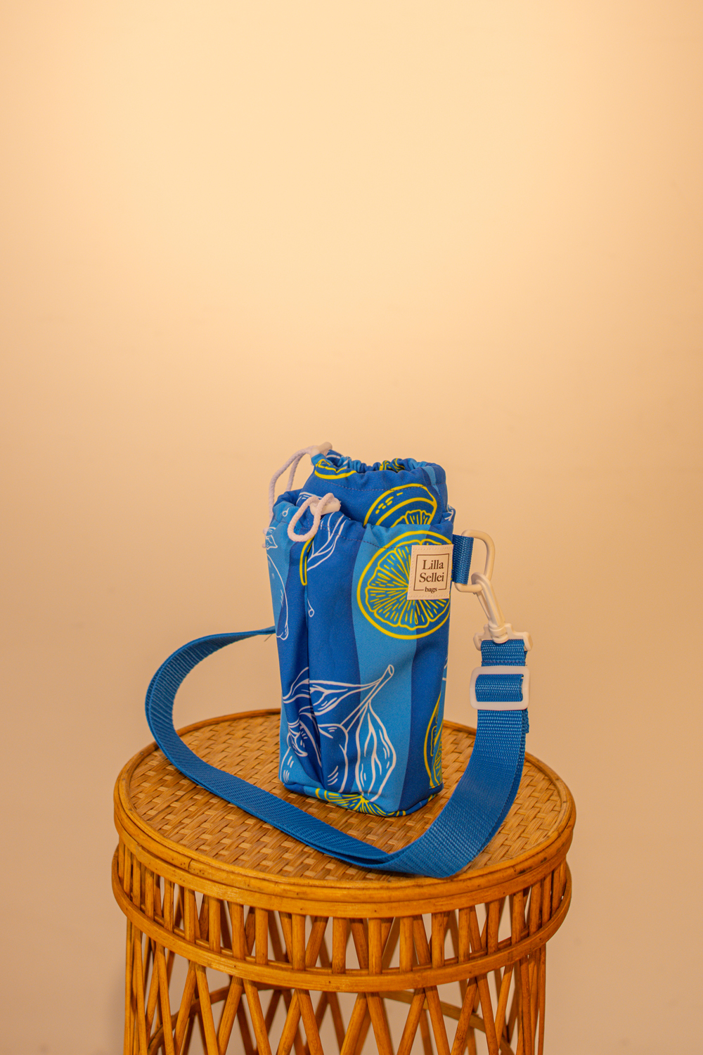 Kisméretű kifejezetten kulacsokhoz tervezett válltáska két extra zsebbel. Kívül a 2026-os tavasz-nyári ADRIA kollekció citrommintás softshell anyagból készült. Csatjai fehérek, a pánt 2 centiméter széles, kék hevederből készült. A táska szája összehúzható, így a kulacs biztosan nem esik ki belőle. Ez a verzió már két extra zsebet is kapott, az egyik oldalra egy lapos, patenttal záródó rekeszt, míg a másik oldalra egy bővebb, összehúzható zsebet. A zsebeknek köszönhetően nemcsak a kulacsodat kaphatod a válladra ezzel a táskával, de jut hely a mobilodnak, a kulcsodnak vagy éppen a papírzsebkendőnek is.