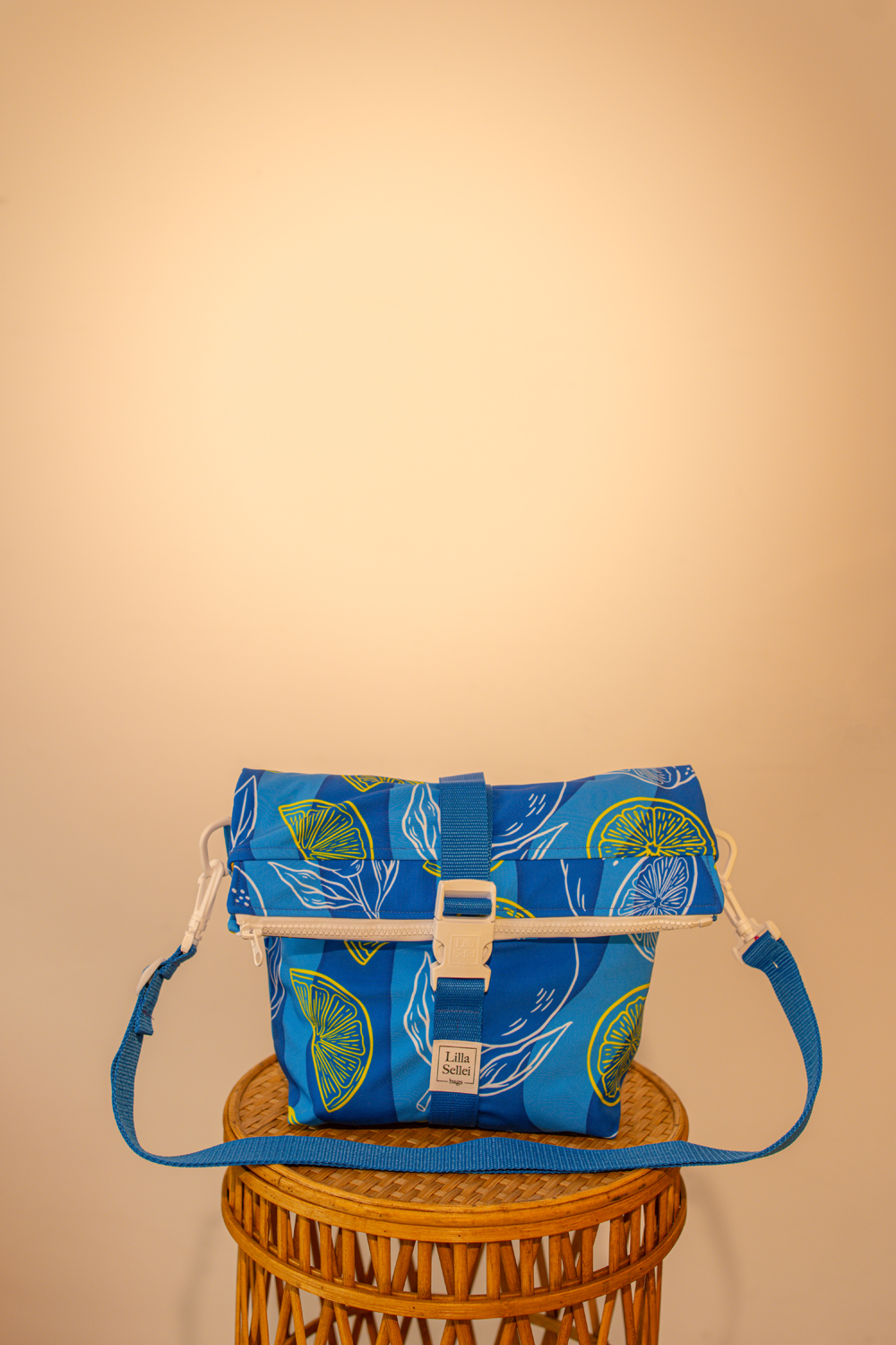 A már jól ismert, nagyméretű, rollos övtáskával azonos méretű mini válltáska, ami kézben, vállon vagy keresztbe vetve is hordható. Kívül a 2026-os tavasz-nyári ADRIA kollekció citrommintás softshell anyagából, belül sárga vászonbéléssel készült. Csatjai fehérek, a hevederek kék. A táska szája cipzárral és egy csattal záródik, rollosan bővíthető. Vállpátja állítható és a táskáról leszerelhető. Ajánljuk nyaraláshoz, városnézéshez, sétához, hétköznapokra, amikor a koktéltáska kicsinek bizonyul.