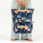 Nagyméretű, kívül a 2024/2025 őszi-téli Kortalanság kollekció geometrikus softshell anyagából, belül sötétkék vászon béléssel készült, rollos típusú hátizsák. A táskán elől található egy két patenttal záródó külső zseb, cipzáros belső zsebe pedig két patenttal rögzíthető a táska belsejéhez, de külön neszeszerként vagy koktéltáskaként, sőt övre/övtáskára fűzve is hordható. Pántjai arany színűek, puha szivaccsal ellátottak. A csatja feketék, a többi műanyag kellék is. A rollosan letekerhető szája egy csattal és két patenttal záródik, a száját kitekerve a táska űrtartalma bővíthető. A táska egyik oldalán kétkocsis cipzár fut végig, megkönnyítve a pakolást. A táska oldalrészei patenttal zárhatóak össze, így a hátizsák szélessége szabályozható.