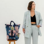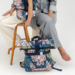 Nagyméretű, kívül a 2024/2025 őszi-téli Kortalanság kollekció virágos softshell anyagából, belül sötétkék vászon béléssel készült, rollos típusú hátizsák. A táskán elől található egy két patenttal záródó külső zseb, cipzáros belső zsebe pedig két patenttal rögzíthető a táska belsejéhez, de külön neszeszerként vagy koktéltáskaként, sőt övre/övtáskára fűzve is hordható. Pántjai sötétkék színűek, puha szivaccsal ellátottak. A csatja feketék, a többi műanyag kellék is. A rollosan letekerhető szája egy csattal és két patenttal záródik, a száját kitekerve a táska űrtartalma bővíthető. A táska egyik oldalán kétkocsis cipzár fut végig, megkönnyítve a pakolást. A táska oldalrészei patenttal zárhatóak össze, így a hátizsák szélessége szabályozható.