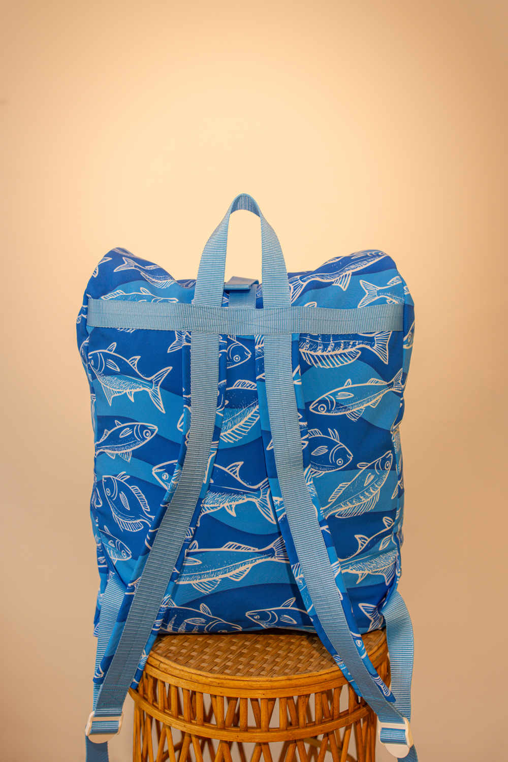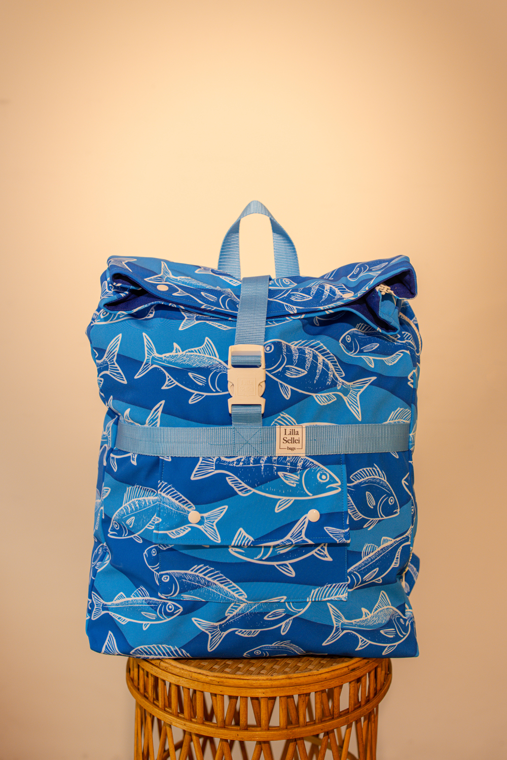 Nagyméretű, kívül a 2026-os tavasz-nyári ADRIA kollekció halmintás softshell anyagából, belül kék vászonbéléssel készült rollos típusú hátizsák. A táskán elől található egy két patenttal záródó külső zseb, cipzáros belső zsebe pedig két patenttal rögzíthető a táska belsejéhez, de külön neszeszerként vagy koktéltáskaként, sőt övre/övtáskára fűzve is hordható. Pántjai világos kék színűek, puha szivaccsal ellátottak. A csatja fehérek, a többi műanyag kellék is. A rollosan letekerhető szája egy csattal és két patenttal záródik, a száját kitekerve a táska űrtartalma bővíthető. A táska egyik oldalán kétkocsis cipzár fut végig, megkönnyítve a pakolást. A táska oldalrészei patenttal zárhatóak össze, így a hátizsák szélessége szabályozható.