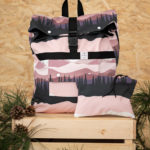 Nagyméretű, kívül a 2023-as tavasz-nyári CAMP kollekció kék, hegyekkel díszített softshell anyagából, belül fekete vászon béléssel készült, rollos típusú hátizsák. A táskán elől található egy két patenttal záródó külső zseb, cipzáros belső zsebe pedig két patenttal rögzíthető a táska belsejéhez, de külön neszeszerként vagy koktéltáskaként, sőt övre/övtáskára fűzve is hordható. Pántjai feketék színűek, puha szivaccsal ellátottak. A csatja feketék, a többi műanyag kellék is. A rollosan letekerhető szája egy csattal és két patenttal záródik, a száját kitekerve a táska űrtartalma bővíthető. A táska egyik oldalán kétkocsis cipzár fut végig, megkönnyítve a pakolást. A táska oldalrészei patenttal zárhatóak össze, így a hátizsák szélessége szabályozható.