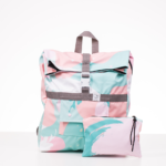 Nagyméretű hátizsák kívül türkiz, virágos softshell anyagból, belül sötétkék vászon béléssel készült, rollos típusú hátizsák. A táskán elől található egy két patenttal záródó külső zseb, a cipzáros belső zseb pedig két patenttal rögzíthető a táska belsejéhez, de külön neszeszerként vagy koktéltáskaként, sőt övre/övtáskára fűzve is hordható. Pántjai szürke színűek, puha, fekete szivaccsal ellátottak. A csatja feketék, a többi műanyag kellék is. A rollosan letekerhető szája egy csattal és két patenttal záródik, a száját kitekerve a táska űrtartalma bővíthető. A táska egyik oldalán kétkocsis cipzár fut végig, megkönnyítve a pakolást. A táska oldalrészei patenttal zárhatóak össze, így a hátizsák szélessége szabályozható.