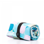 Ez a lekerekített szélű pléd virágos, softshell anyagból készült, tekerés utáni rögzítését egy állítható méretű fekete gumi segíti.