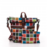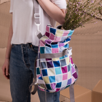 Kívül az tavasz színtípusnak megfelelő árnyalatokból készült kockás softshell anyagból, belül narancssárga vászon béléssel készült, rollos típusú hátizsák. A hátizsákhoz tartozik egy felcsatolható pánt is, így keresztbe vetve is viselhető. A cipzáros belső zseb két patenttal rögzíthető a táska belsejéhez, de külön neszeszerként vagy koktéltáskaként is hodhatót a hátuljára varrt bújtatóknak köszönhetően, akár az övtáska pántjára vagy egy külön övre felfűzve is hordható. Letekerhető szája egy csattal és cipzárral záródik. Pántjai narancssárga színűek, a csat és a többi műanyag kellék fehér.