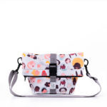 Kívül virágos tél mintás softshell anyagból, belül fekete vászon béléssel készült, variálható válltáska. A kézben és vállon egyaránt hordható táskához tartozik egy felcsatolható pánt is, így keresztbe vetve is viselhető. Cipzáros belső zsebe két patenttal rögzíthető a táska belsejéhez, de külön neszeszerként vagy koktéltáskaként is hordható. A neszeszeren kívül még két tároló rekesze van: egy patentos zseb a táska elején, egy zseb pedig a belsejében. Pántjai feketék, a csatok és a többi műanyag kellék szintén. Szája cipzárral záródik.