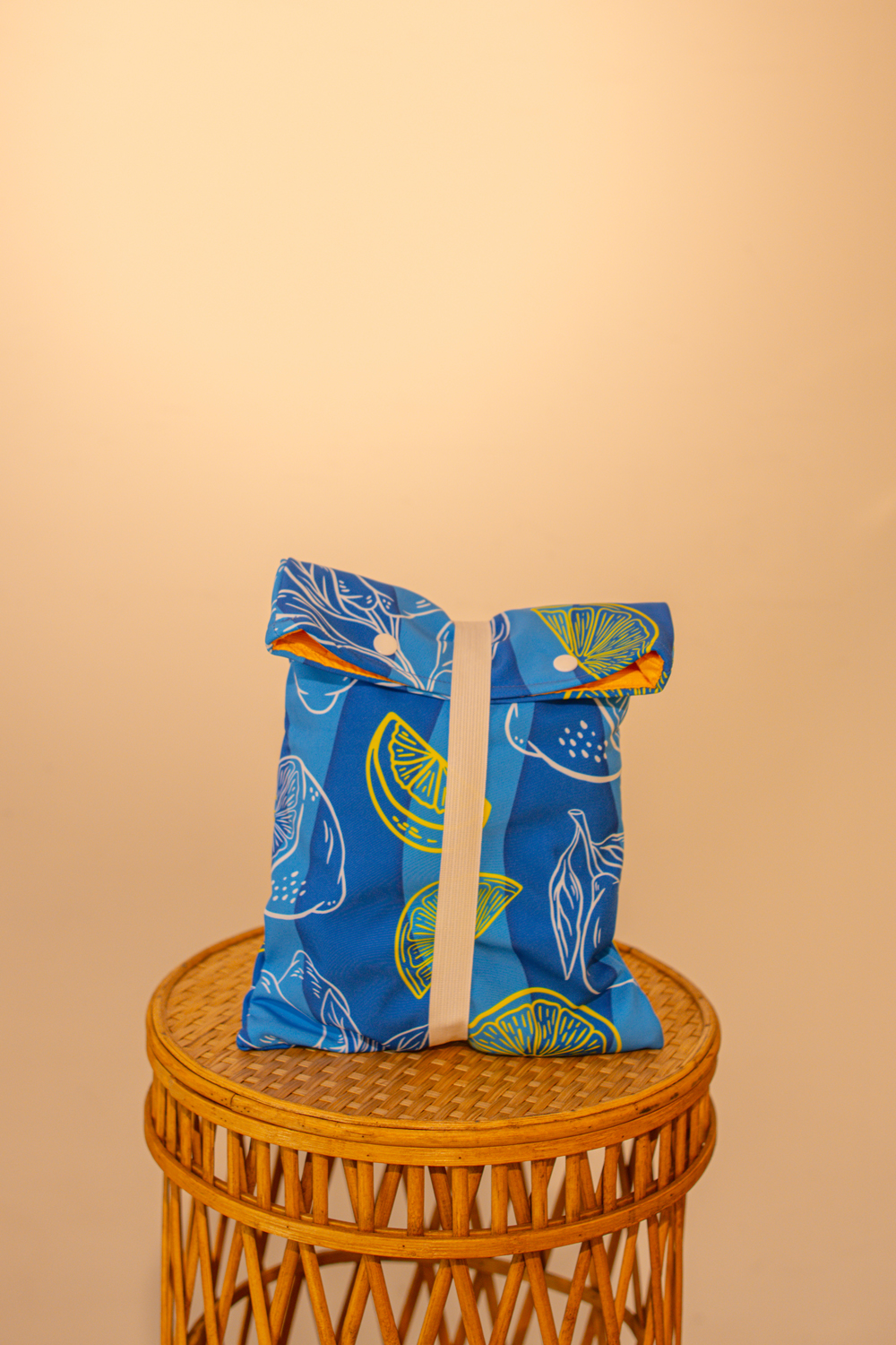 Állítható méretű, kívül a 2026-os tavasz-nyári ADRIA kollekció citrommintás softshell anyagából, belül egy vékonyabb, vízlepergetős anyagból készült zsák. Ajánljuk pelenkához, sportcucc, fürdőruha tárolására vagy akár szendvicsek, péksütemény szállításához. Teljesen kitekert állapotban három darab mosható pelenka fér bele, de mérete fokozatmentesen állítható bármilyen, éppen szükséges méretre. A zsák szája két patenttal záródik, letekerhető és az állítható gumipánttal fixálható.